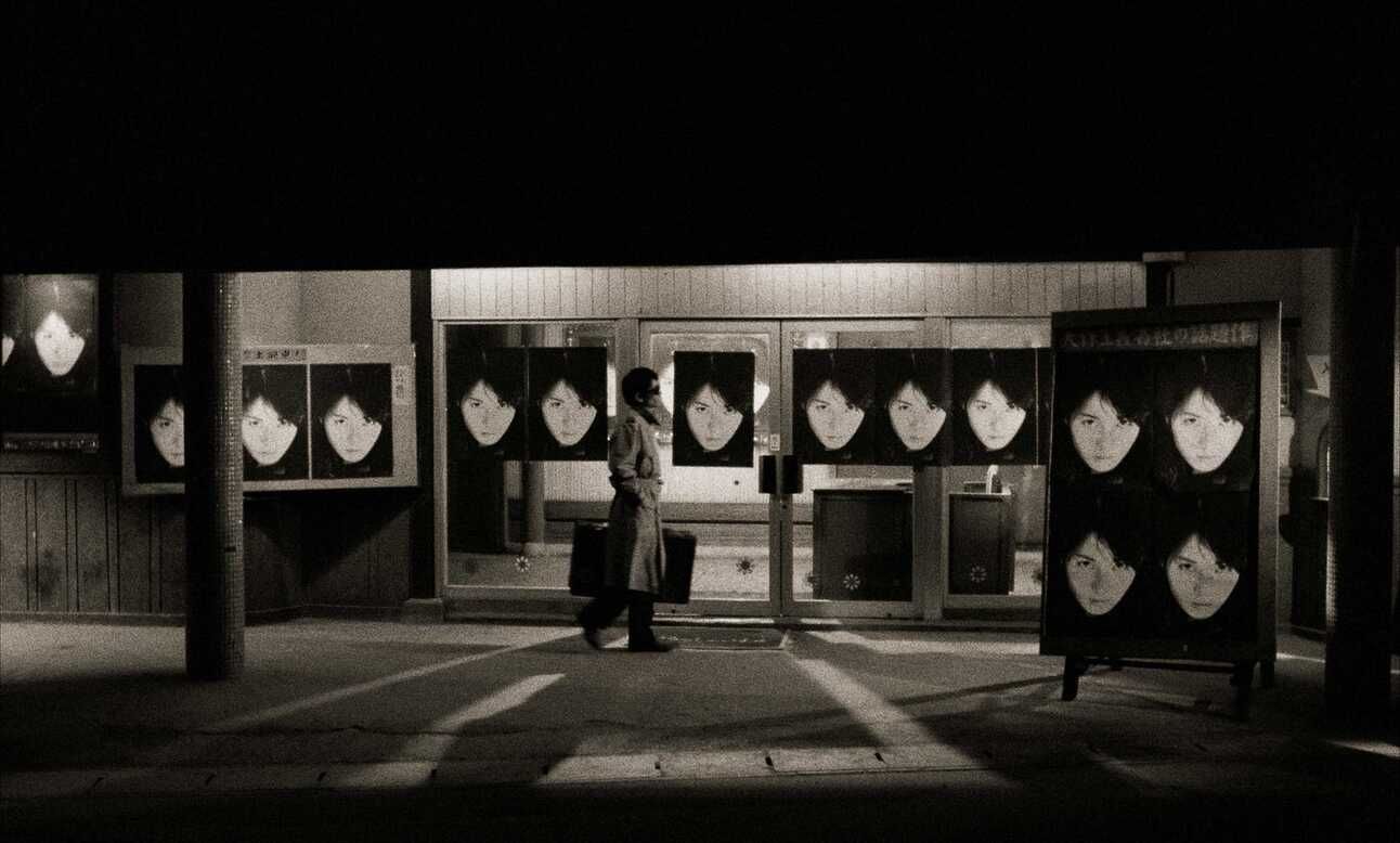 When we return, the colour has dissipated from the screen, now a sepia black and white, Kōichi has come back, but three years have passed; this town is not the same. The streets are empty and have seemingly fallen into disrepair, plastered across buildings is a poster of a woman draped in a hood, looking directly at the camera.